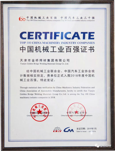 金橋焊材集團榮獲2018年中國機械工業(yè)百強企業(yè)稱號
